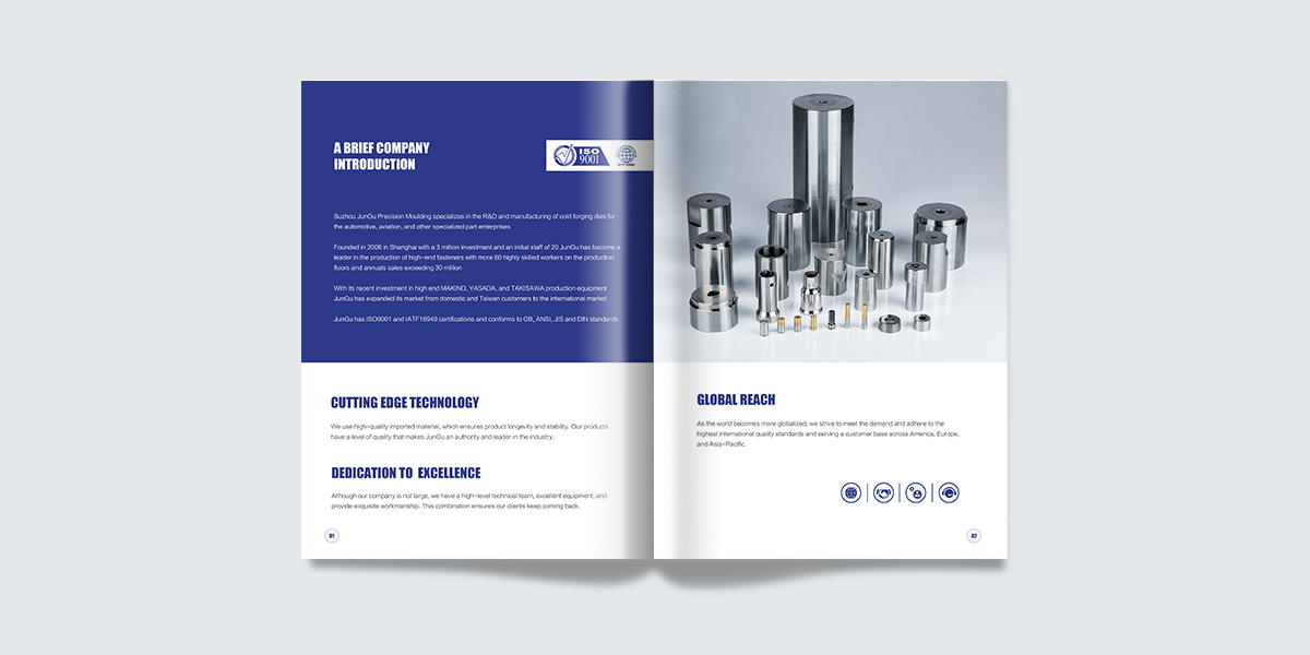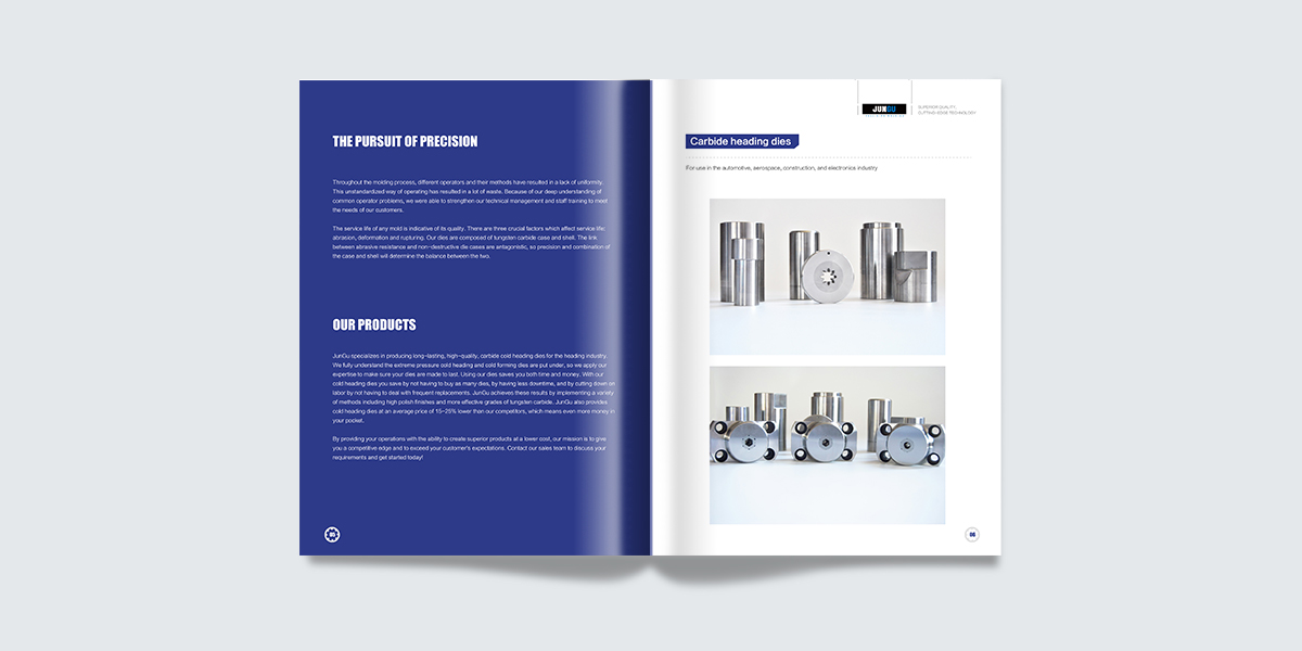 鈞固精密模具是專業(yè)從事冷鐓模具的研發(fā)生產(chǎn)企業(yè),一直配套與汽車、航空等高端緊固件及異型零部件的企業(yè),公司擁有一批多年冷鐓操作、設(shè)計(jì)、及模具制造的技術(shù)團(tuán)隊(duì)并與國內(nèi)外多家知名大型汽車緊固件廠保持長期合作。公司主要產(chǎn)品有:多工位螺栓螺母模具、硬質(zhì)合金異型模、以及冷鐓設(shè)備周邊各種配件。蘇州畫冊設(shè)計(jì)/吳江畫冊設(shè)計(jì)/昆山畫冊設(shè)計(jì)-蘇州覺世品牌策劃有限公司
