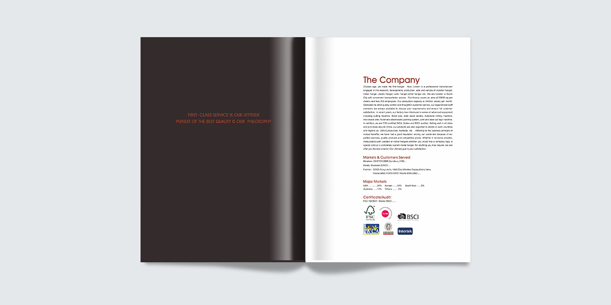林聯(lián)東家居用品有限公司是一家工貿(mào)型企業(yè),成立于2000年,主要生產(chǎn)經(jīng)營木衣架、金屬衣架、塑料衣架,包布衣架等,共有超過230名員工,擁有下屬生產(chǎn)企業(yè)桂林聯(lián)興家居用品有限公司。產(chǎn)品出口歐洲、美國、澳大利亞、南美洲、亞洲等地。蘇州宣傳冊設(shè)計 / 蘇州畫冊設(shè)計/吳江畫冊設(shè)計/昆山畫冊設(shè)計-吳江廣告公司