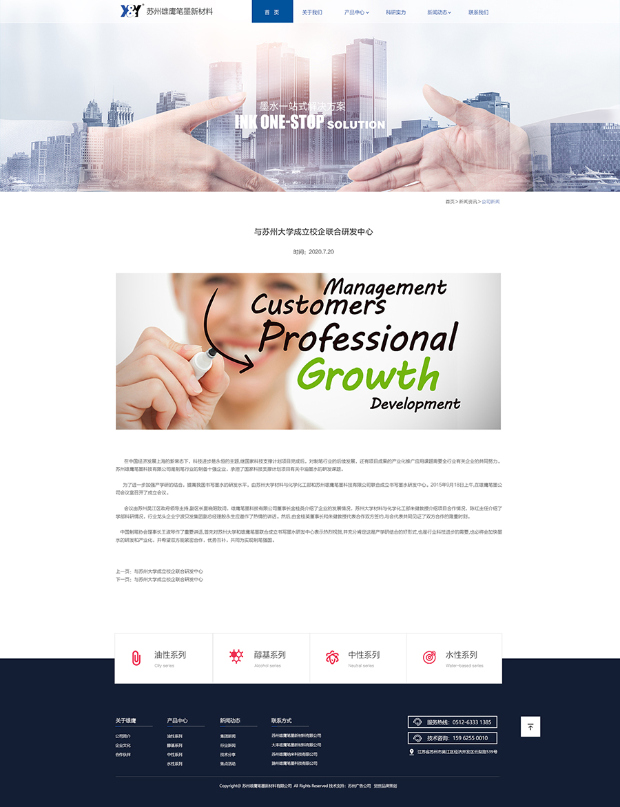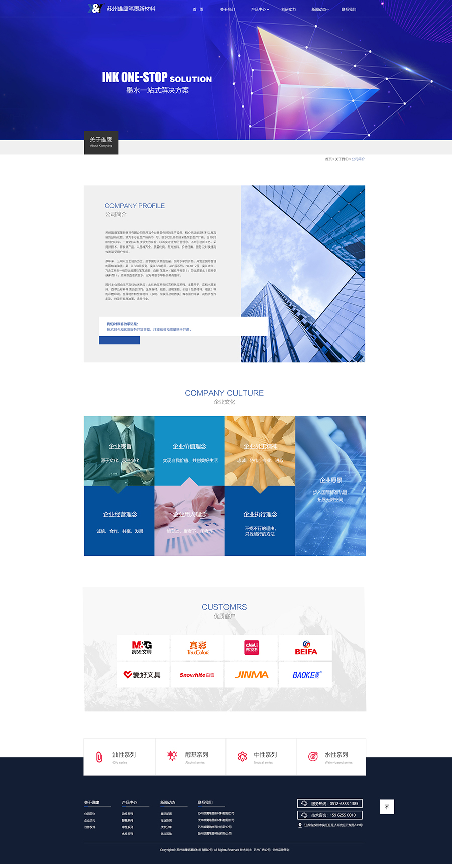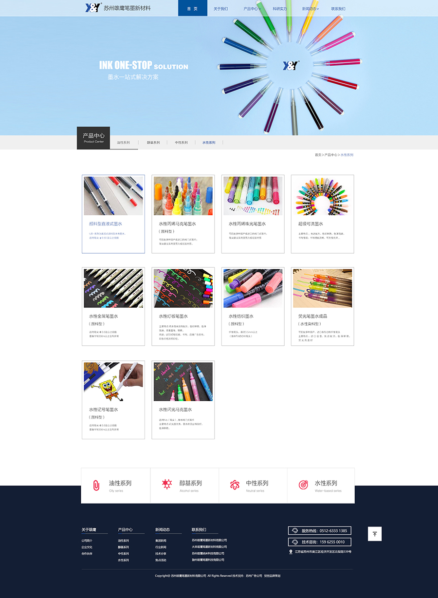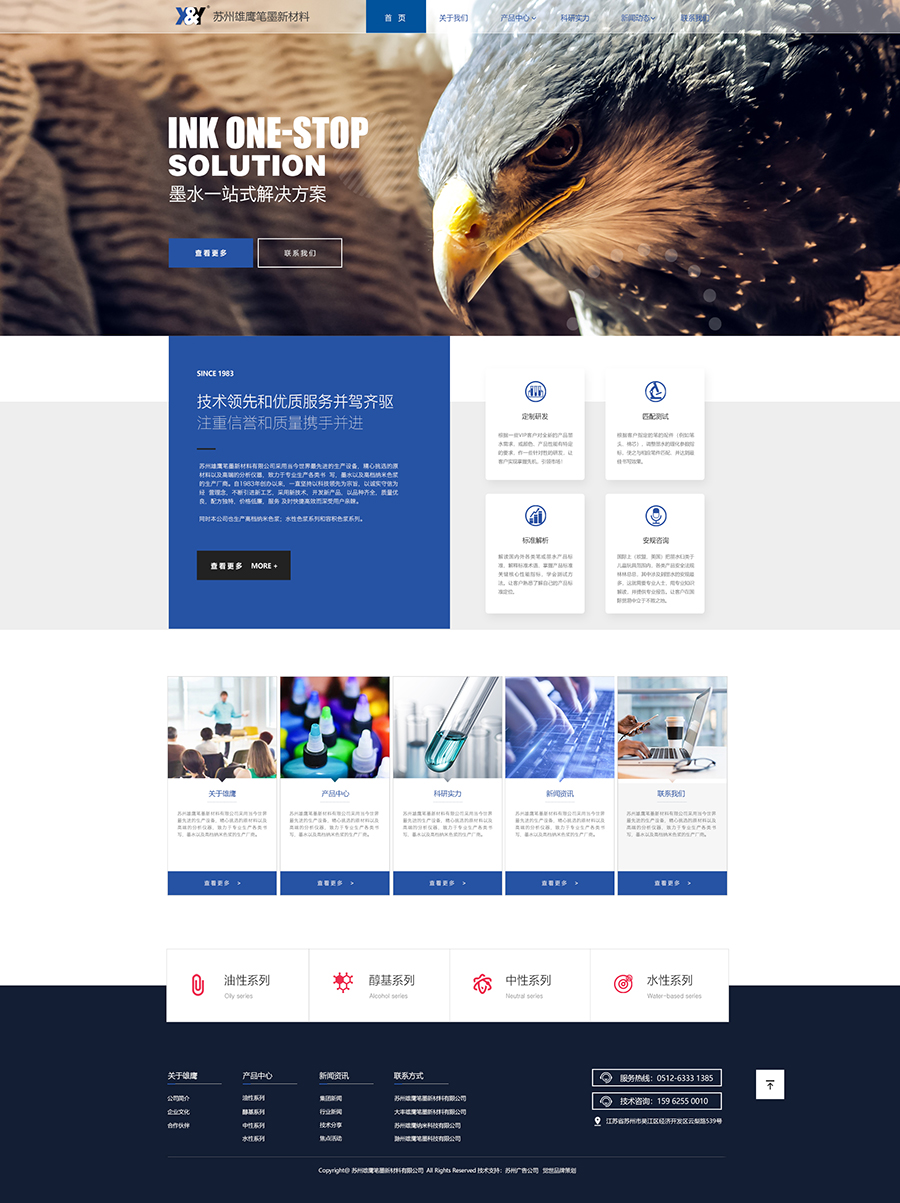 蘇州雄鷹筆墨新材料有限公司采用當(dāng)今世界最先進(jìn)的生產(chǎn)設(shè)備,精心挑選的原材料以及高端的分析儀器,致力于專業(yè)生產(chǎn)各類書 寫,墨水以及高檔納米色漿的生產(chǎn)廠商。自1983年創(chuàng)辦以來(lái),一直堅(jiān)持以科技領(lǐng)先為宗旨,以誠(chéng)實(shí)守信為經(jīng) 營(yíng)理念,響應(yīng)式網(wǎng)站建設(shè) 不斷引進(jìn)新工藝,采用新技術(shù),開(kāi)發(fā)新產(chǎn)品,以品種齊全,質(zhì)量?jī)?yōu)良,配方獨(dú)特,價(jià)格低廉,服務(wù) 及時(shí)快捷高效而深受用戶親睞。